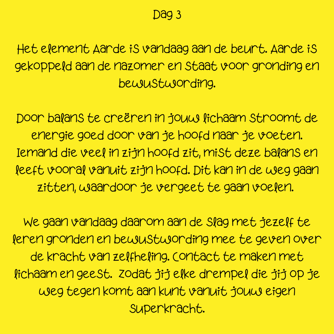 Je krijgt handvatten aangereikt die jou zullen ondersteunen in moeilijke situaties doordat jij de tools hebt om stevig in je schoenen te staan en emoties te doorvoelen, een plek te geven en los te laten, zodat jij voorkomt dat blokkades zich vastzetten in jouw lichaam. Spelenderwijs leer je zelfheling toe te passen, jezelf te gronden zodat je energie beter doorstroomt en je balans creëert, je leert je adem in te zetten als een krachtige tool om emoties te reguleren en overzicht voor jezelf te creëren wanneer dat nodig is tijdens bijvoorbeeld een ruzie thuis of op school. Je leert je grenzen aangeven en je wordt je bewust van jouw eigen kernwaardes.